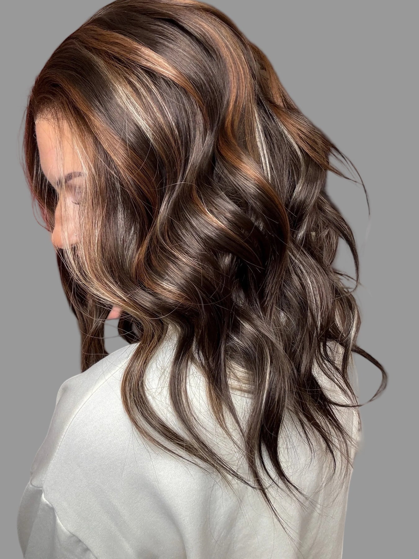 This unit is a premium, futura fiber, lace front wig, 13 x 4 lace, average OR small cap size, 120% density, closed cap with clips, 21" length, pre-plucked hairline, extra secure band. Espresso brunette base, with ribbons of milk chocolate, and ash brunette highlights.