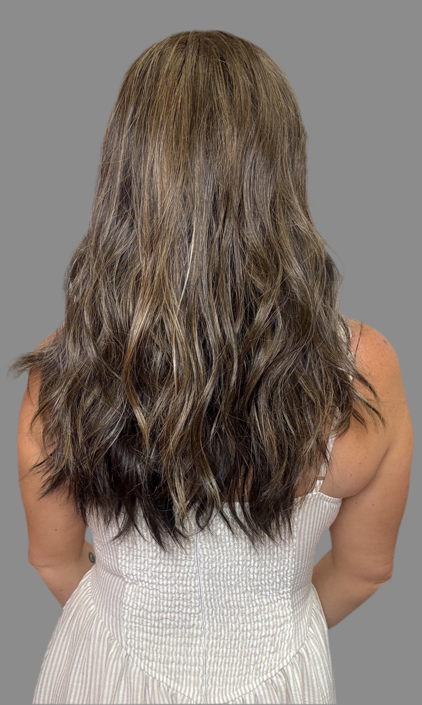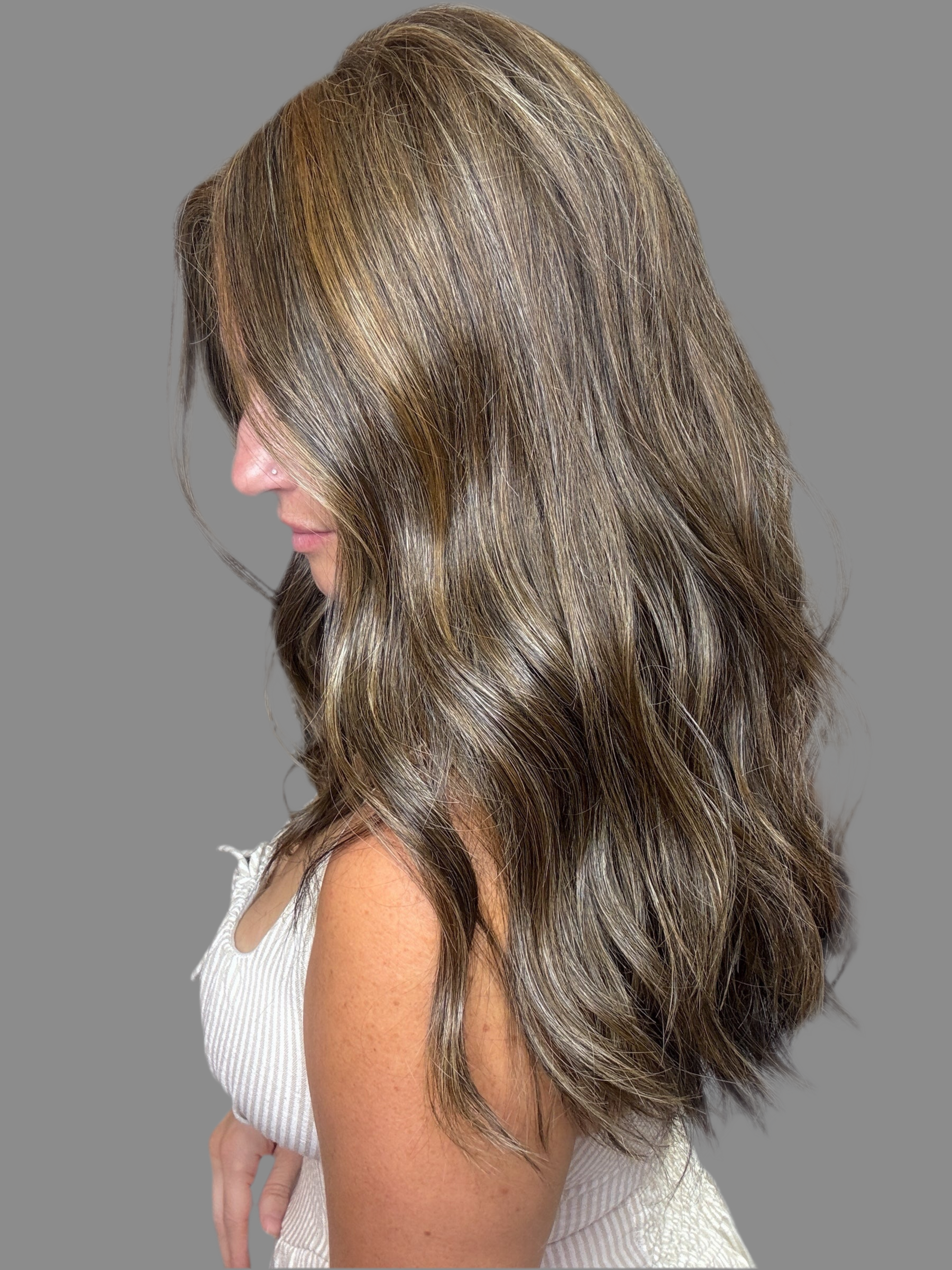 This rich, dimensional shade features a brunette base blended with soft blonde and warm copper highlights for a multi-tonal finish that catches the light and turns heads. With a natural contrast of a brunette under-layer.