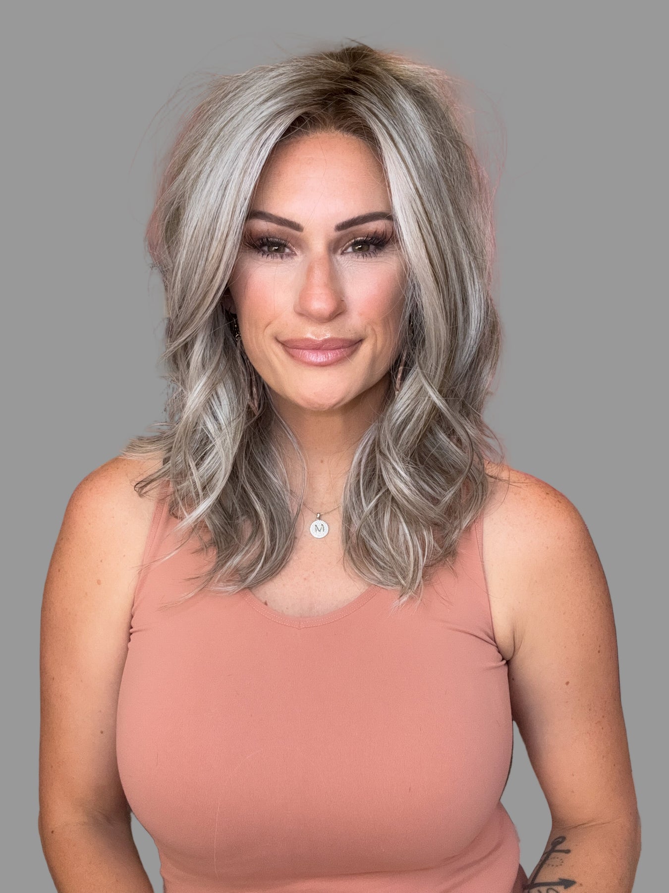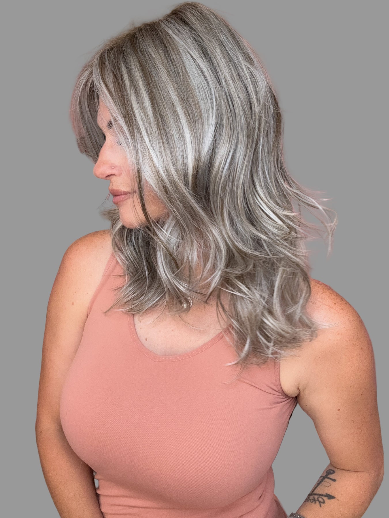 This style stuns in a cool-toned ash blonde base with silvery undertones, woven with bright platinum strands that create a luminous, icy shimmer. The blend of frosty silver, pale ash, and subtle beige tones gives striking dimension without warmth, resulting in a sophisticated, modern finish.