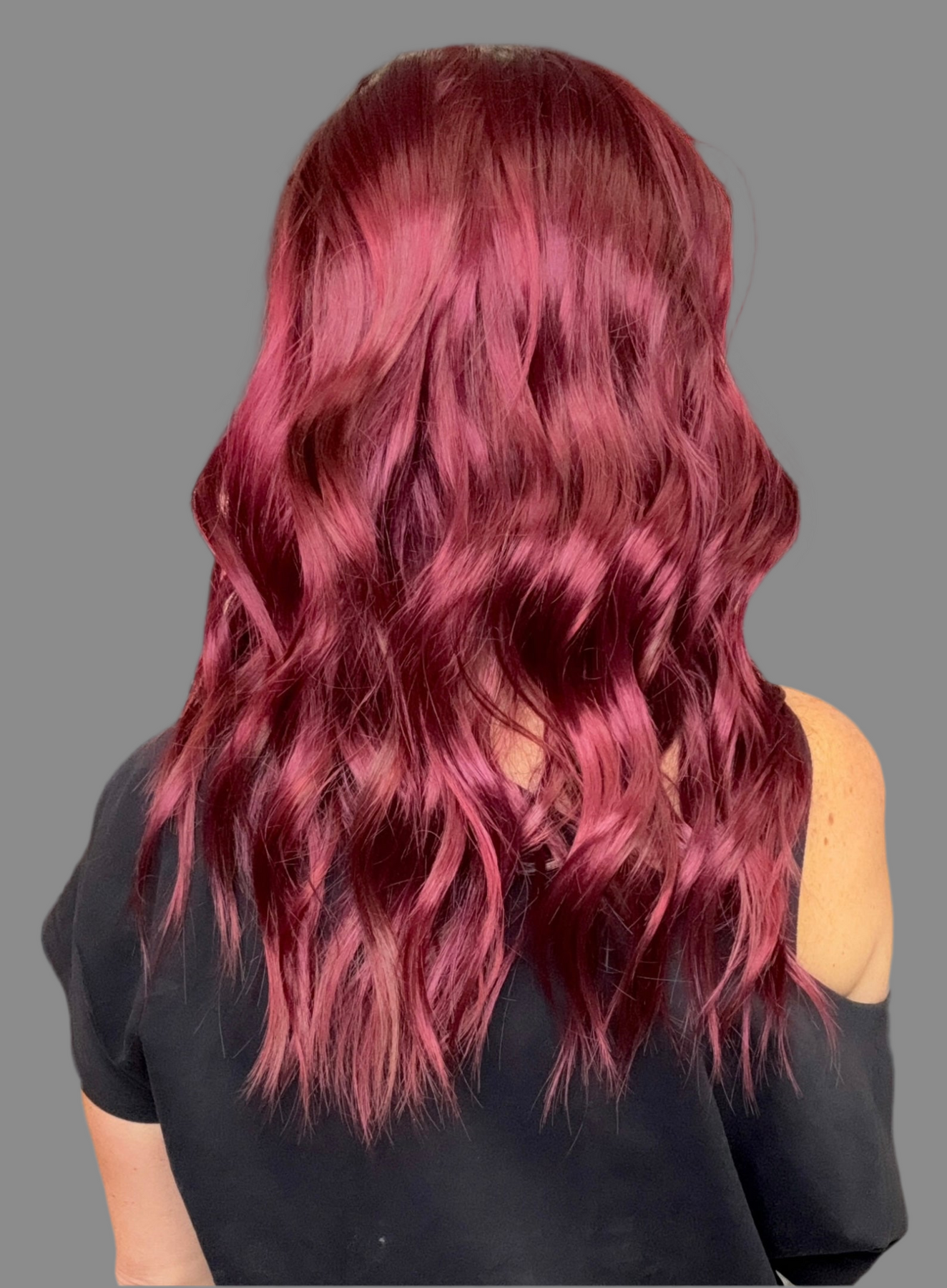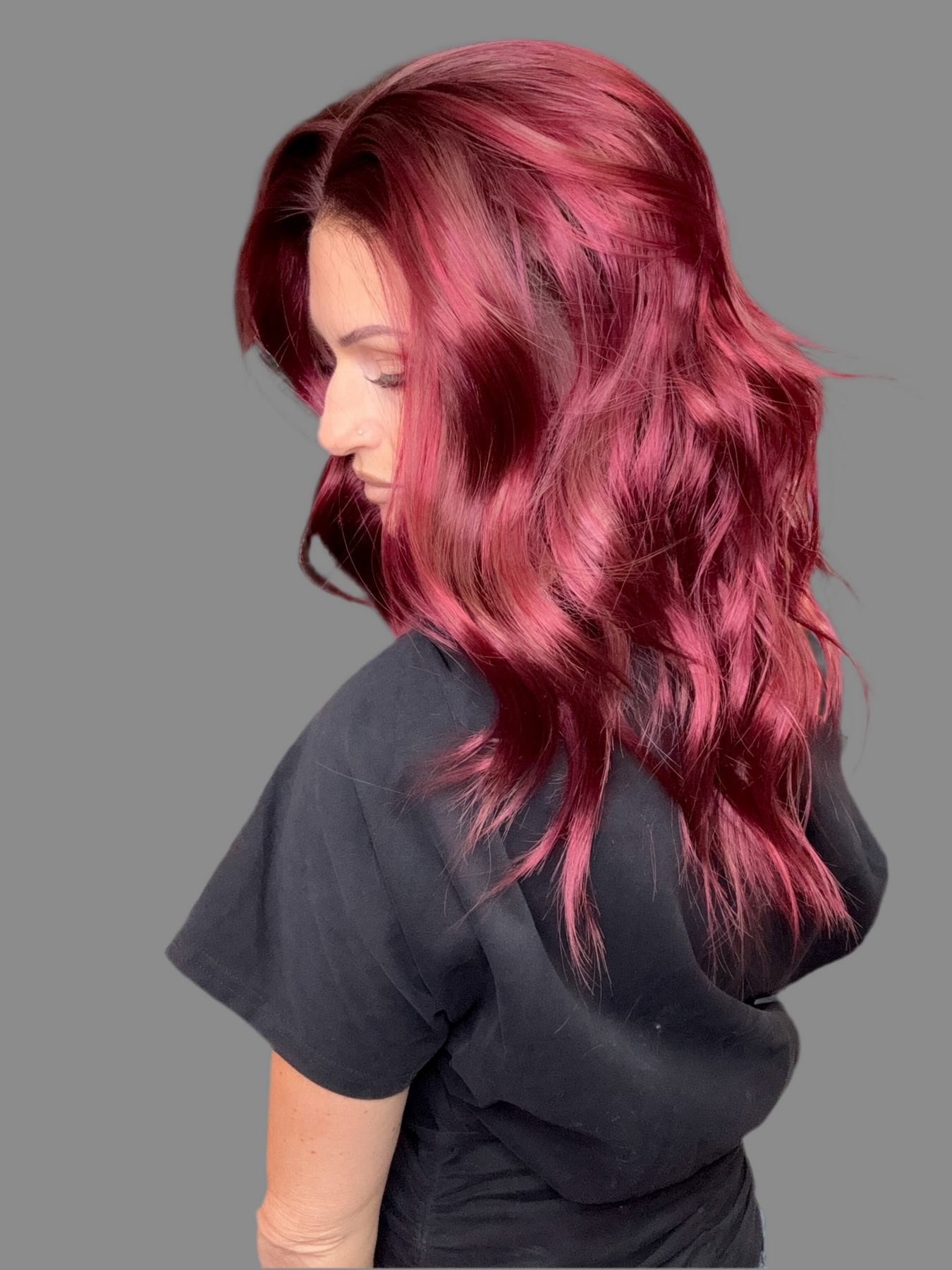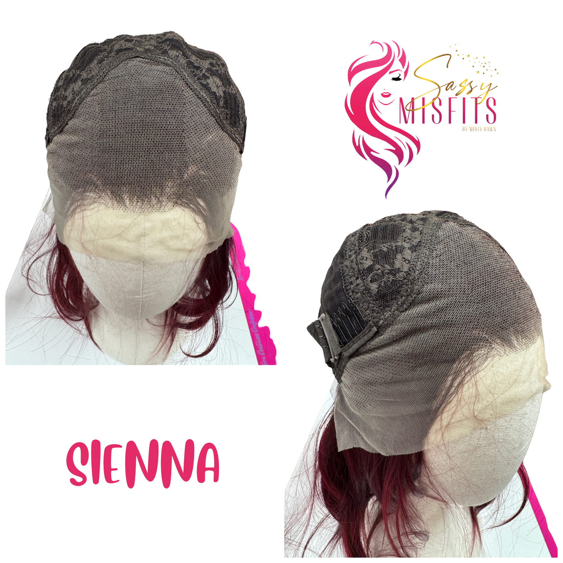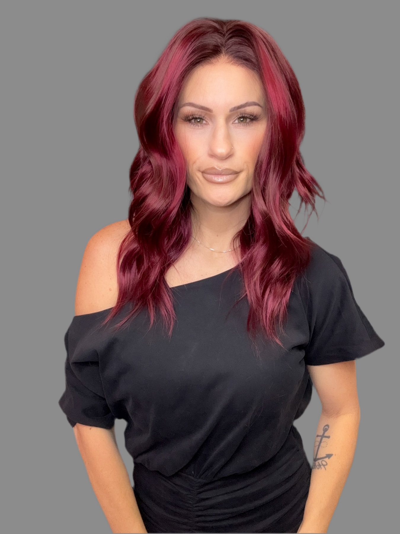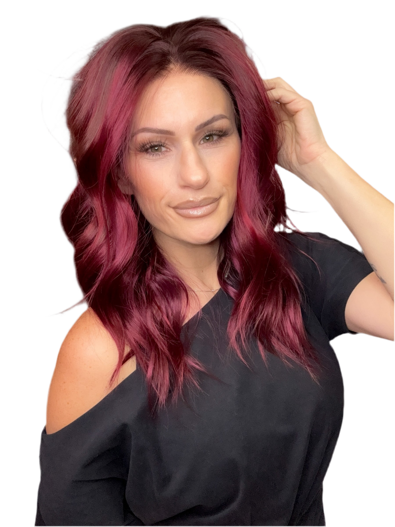 This unit is a premium, futura fiber, lace front wig, 13 x 4 lace, average OR small cap size, 120% density, closed cap with clips, 21" length, pre-plucked hairline, extra secure band. Breathtaking burnt crimson with pops of cherry color & plum.